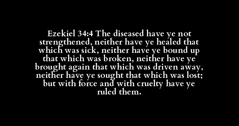 Ezekiel 34:4 The diseased have ye not strengthened, neither have ye healed that which was sick, neither have ye bound up that which was broken, neither have ye brought again that which was driven away, neither have ye sought that which was lost; but with force and with cruelty have ye ruled them.
