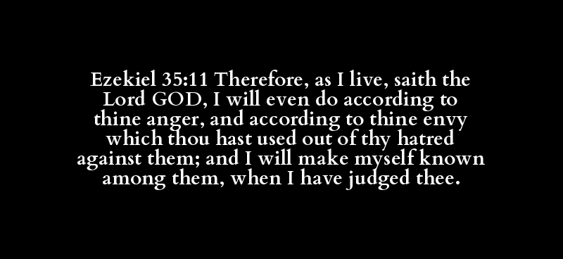 Ezekiel 35:11 Therefore, as I live, saith the Lord GOD, I will even do according to thine anger, and according to thine envy which thou hast used out of thy hatred against them; and I will make myself known among them, when I have judged thee.