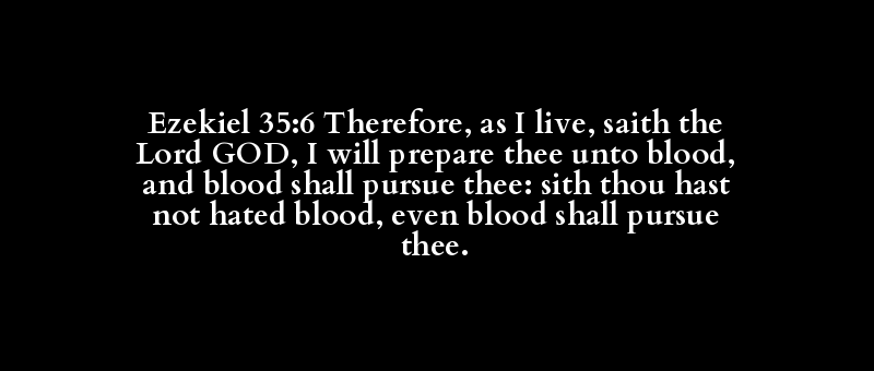 Ezekiel 35:6 Therefore, as I live, saith the Lord GOD, I will prepare thee unto blood, and blood shall pursue thee: sith thou hast not hated blood, even blood shall pursue thee.