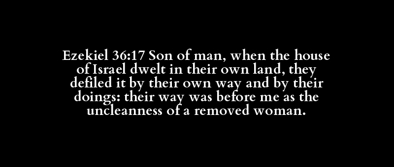 Ezekiel 36:17 Son of man, when the house of Israel dwelt in their own land, they defiled it by their own way and by their doings: their way was before me as the uncleanness of a removed woman.