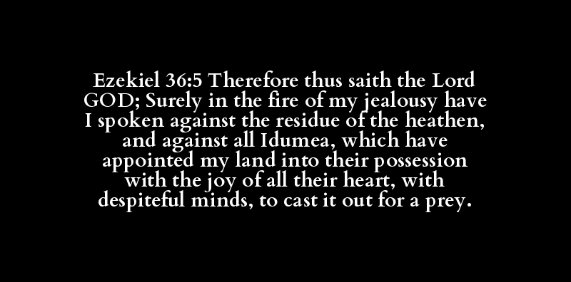 Ezekiel 36:5 Therefore thus saith the Lord GOD; Surely in the fire of my jealousy have I spoken against the residue of the heathen, and against all Idumea, which have appointed my land into their possession with the joy of all their heart, with despiteful minds, to cast it out for a prey.