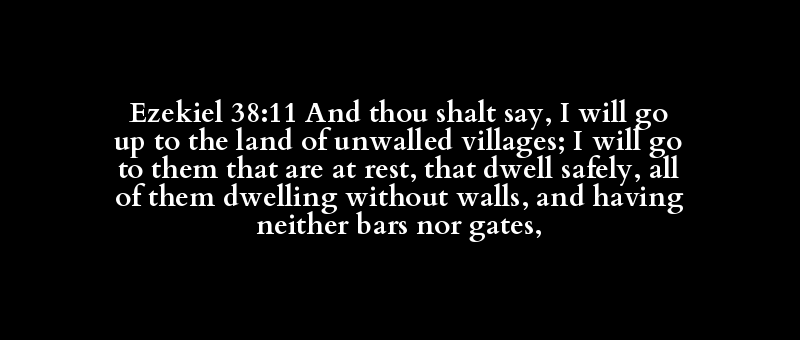Ezekiel 38:11 And thou shalt say, I will go up to the land of unwalled villages; I will go to them that are at rest, that dwell safely, all of them dwelling without walls, and having neither bars nor gates,