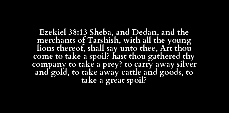 Ezekiel 38:13 Sheba, and Dedan, and the merchants of Tarshish, with all the young lions thereof, shall say unto thee, Art thou come to take a spoil? hast thou gathered thy company to take a prey? to carry away silver and gold, to take away cattle and goods, to take a great spoil?