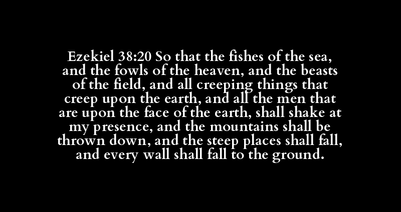 Ezekiel 38:20 So that the fishes of the sea, and the fowls of the heaven, and the beasts of the field, and all creeping things that creep upon the earth, and all the men that are upon the face of the earth, shall shake at my presence, and the mountains shall be thrown down, and the steep places shall fall, and every wall shall fall to the ground.