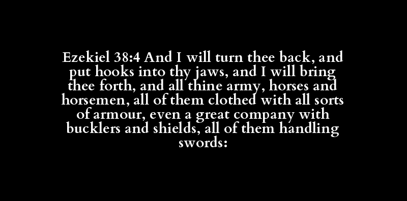 Ezekiel 38:4 And I will turn thee back, and put hooks into thy jaws, and I will bring thee forth, and all thine army, horses and horsemen, all of them clothed with all sorts of armour, even a great company with bucklers and shields, all of them handling swords: