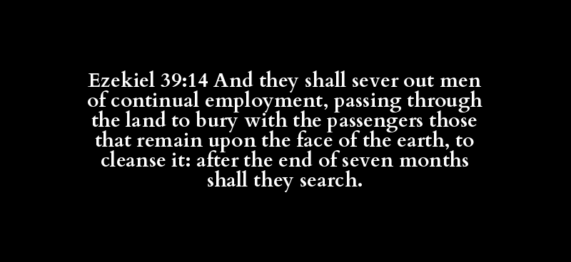 Ezekiel 39:14 And they shall sever out men of continual employment, passing through the land to bury with the passengers those that remain upon the face of the earth, to cleanse it: after the end of seven months shall they search.