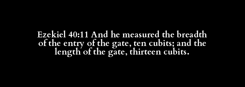 | מָדַד | רֹחַב | פֶּתַח | שַׁעַר | עֶשֶׂר | אַמָּה | אֹרֶךְ | שַׁעַר | עָשָׂר | שָׁלוֹשׁ | אַמָּה |