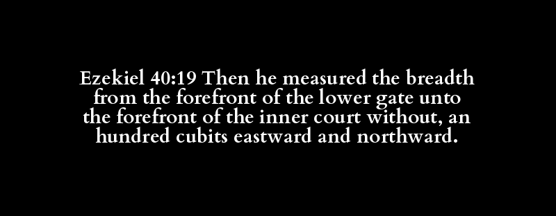 Ezekiel 40:19 Then he measured the breadth from the forefront of the lower gate unto the forefront of the inner court without, an hundred cubits eastward and northward.