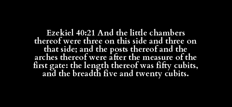 | תָּא | שָׁלוֹשׁ | שָׁלוֹשׁ | אַיִל | אֵילָם | מִדָּה | רִאשׁוֹן | שַׁעַר | אֹרֶךְ | חֲמִשִּׁים | אַמָּה | רֹחַב | חָמֵשׁ | עֶשְׂרִים | אַמָּה |