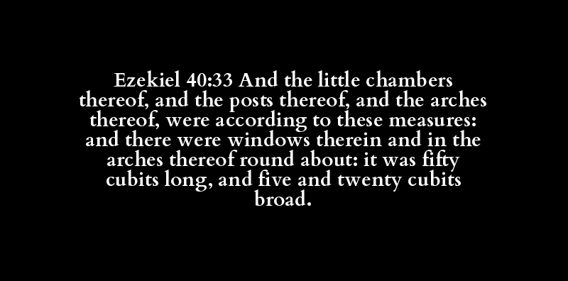 | תָּא | אַיִל | אֵילָם | מִדָּה | חַלּוֹן | אֵילָם | סָבִיב | חֲמִשִּׁים | אַמָּה | אֹרֶךְ | חָמֵשׁ | עֶשְׂרִים | אַמָּה | רֹחַב |