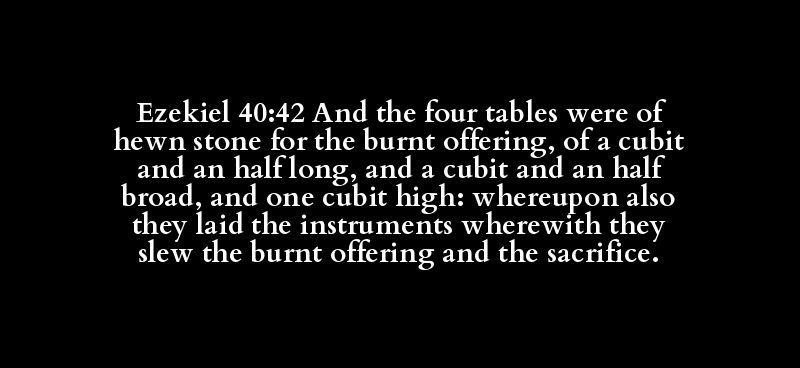 Ezekiel 40:42 And the four tables were of hewn stone for the burnt offering, of a cubit and an half long, and a cubit and an half broad, and one cubit high: whereupon also they laid the instruments wherewith they slew the burnt offering and the sacrifice.