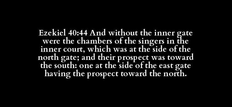 Ezekiel 40:44 And without the inner gate were the chambers of the singers in the inner court, which was at the side of the north gate; and their prospect was toward the south: one at the side of the east gate having the prospect toward the north.