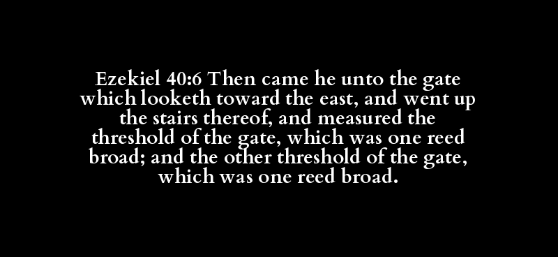Ezekiel 40:6 Then came he unto the gate which looketh toward the east, and went up the stairs thereof, and measured the threshold of the gate, which was one reed broad; and the other threshold of the gate, which was one reed broad.