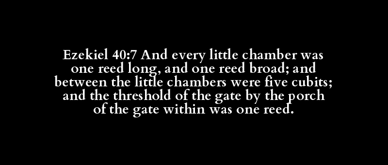 | תָּא | אֶחָד | קָנֶה | אֹרֶךְ | אֶחָד | קָנֶה | רֹחַב | תָּא | חָמֵשׁ | אַמָּה | סַף | שַׁעַר | אֵצֶל | אוּלָם | שַׁעַר | בַּיִת | אֶחָד | קָנֶה |