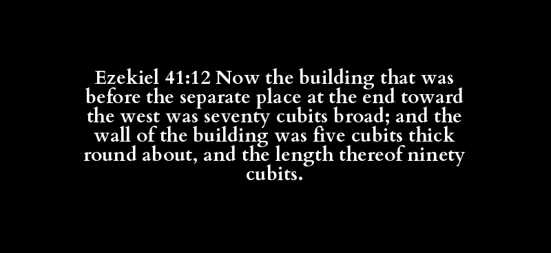 Ezekiel 41:12 Now the building that was before the separate place at the end toward the west was seventy cubits broad; and the wall of the building was five cubits thick round about, and the length thereof ninety cubits.