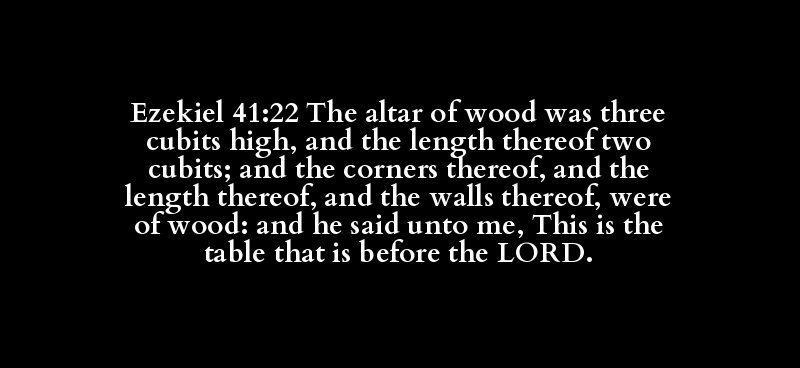 Ezekiel 41:22 The altar of wood was three cubits high, and the length thereof two cubits; and the corners thereof, and the length thereof, and the walls thereof, were of wood: and he said unto me, This is the table that is before the LORD.