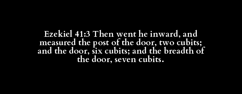 Ezekiel 41:3 Then went he inward, and measured the post of the door, two cubits; and the door, six cubits; and the breadth of the door, seven cubits.