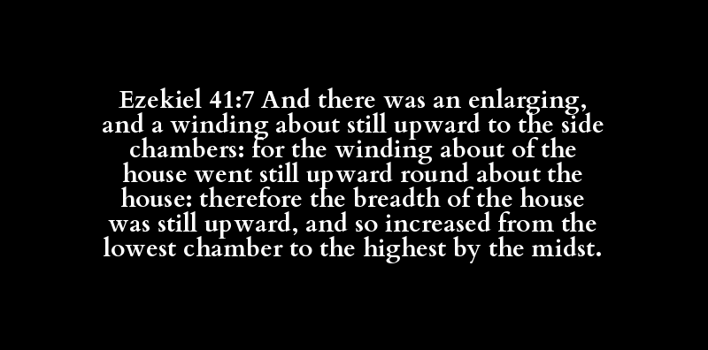 Ezekiel 41:7 And there was an enlarging, and a winding about still upward to the side chambers: for the winding about of the house went still upward round about the house: therefore the breadth of the house was still upward, and so increased from the lowest chamber to the highest by the midst.