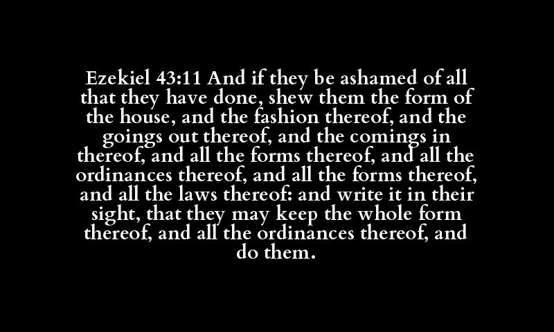 Ezekiel 43:11 And if they be ashamed of all that they have done, shew them the form of the house, and the fashion thereof, and the goings out thereof, and the comings in thereof, and all the forms thereof, and all the ordinances thereof, and all the forms thereof, and all the laws thereof: and write it in their sight, that they may keep the whole form thereof, and all the ordinances thereof, and do them.