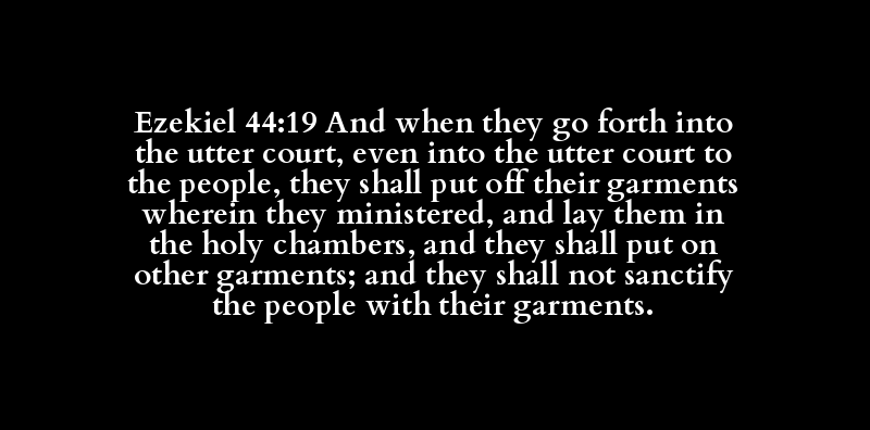 Ezekiel 44:19 And when they go forth into the utter court, even into the utter court to the people, they shall put off their garments wherein they ministered, and lay them in the holy chambers, and they shall put on other garments; and they shall not sanctify the people with their garments.