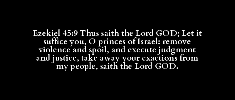 Ezekiel 45:9 Thus saith the Lord GOD; Let it suffice you, O princes of Israel: remove violence and spoil, and execute judgment and justice, take away your exactions from my people, saith the Lord GOD.