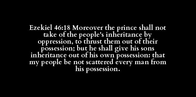 Ezekiel 46:18 Moreover the prince shall not take of the people's inheritance by oppression, to thrust them out of their possession; but he shall give his sons inheritance out of his own possession: that my people be not scattered every man from his possession.