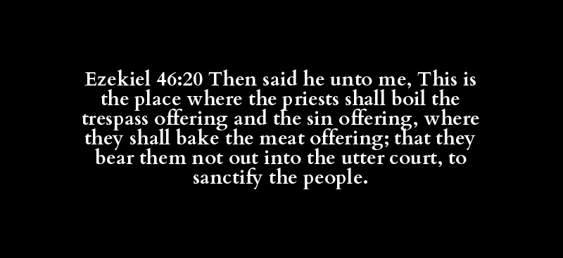 Ezekiel 46:20 Then said he unto me, This is the place where the priests shall boil the trespass offering and the sin offering, where they shall bake the meat offering; that they bear them not out into the utter court, to sanctify the people.