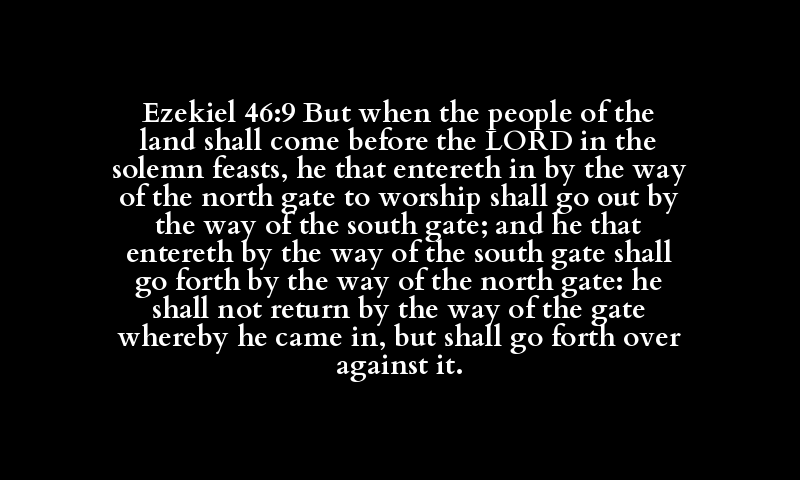 Ezekiel 46:9 But when the people of the land shall come before the LORD in the solemn feasts, he that entereth in by the way of the north gate to worship shall go out by the way of the south gate; and he that entereth by the way of the south gate shall go forth by the way of the north gate: he shall not return by the way of the gate whereby he came in, but shall go forth over against it.
