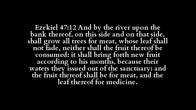 Ezekiel 47:12 And by the river upon the bank thereof, on this side and on that side, shall grow all trees for meat, whose leaf shall not fade, neither shall the fruit thereof be consumed: it shall bring forth new fruit according to his months, because their waters they issued out of the sanctuary: and the fruit thereof shall be for meat, and the leaf thereof for medicine.