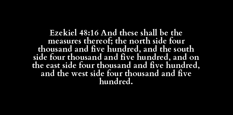 Ezekiel 48:16 And these shall be the measures thereof; the north side four thousand and five hundred, and the south side four thousand and five hundred, and on the east side four thousand and five hundred, and the west side four thousand and five hundred.