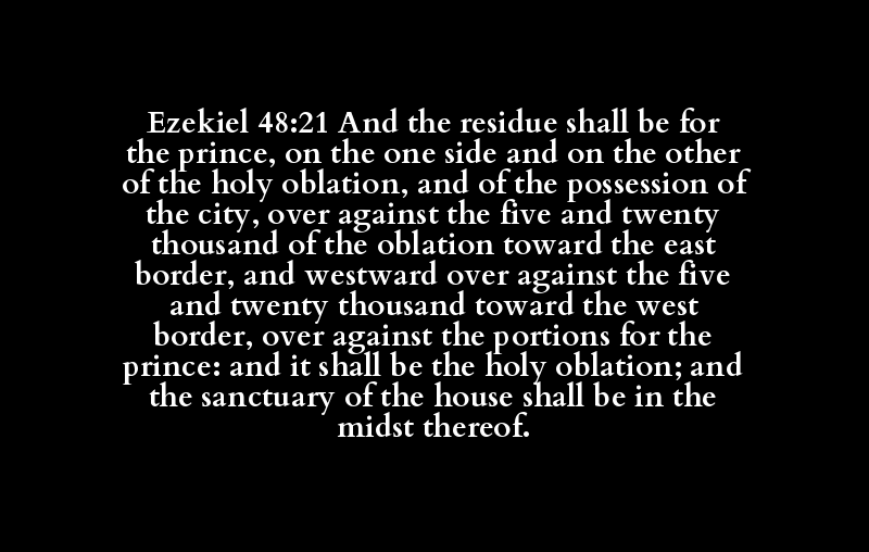 Ezekiel 48:21 And the residue shall be for the prince, on the one side and on the other of the holy oblation, and of the possession of the city, over against the five and twenty thousand of the oblation toward the east border, and westward over against the five and twenty thousand toward the west border, over against the portions for the prince: and it shall be the holy oblation; and the sanctuary of the house shall be in the midst thereof.