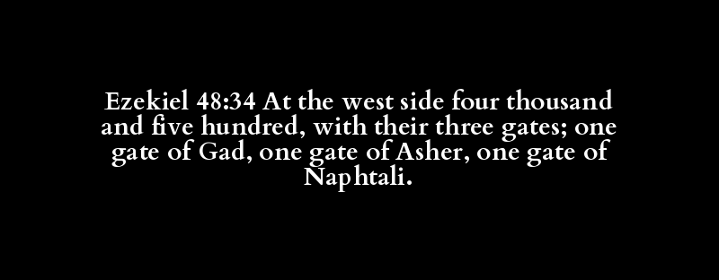 | יָם | פֵּאָה | אַרְבַּע | אֶלֶף | חָמֵשׁ | מֵאָה | שָׁלוֹשׁ | שַׁעַר | אֶחָד | שַׁעַר | גָּד | אֶחָד | שַׁעַר | אָשֵׁר | אֶחָד | שַׁעַר | נַפְתָּלִי |