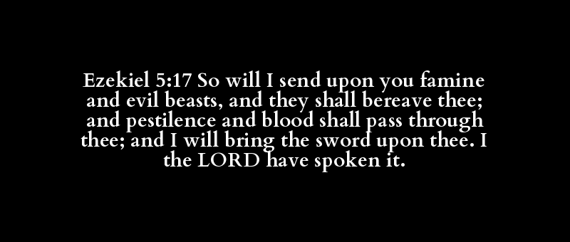 Ezekiel 5:17 So will I send upon you famine and evil beasts, and they shall bereave thee; and pestilence and blood shall pass through thee; and I will bring the sword upon thee. I the LORD have spoken it.