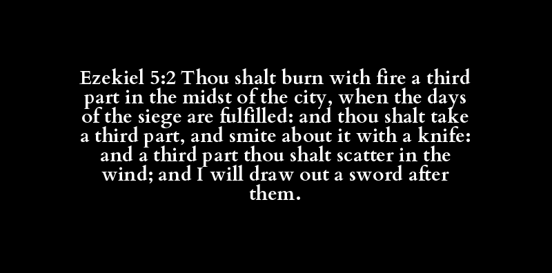 Ezekiel 5:2 Thou shalt burn with fire a third part in the midst of the city, when the days of the siege are fulfilled: and thou shalt take a third part, and smite about it with a knife: and a third part thou shalt scatter in the wind; and I will draw out a sword after them.