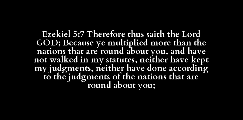 Ezekiel 5:7 Therefore thus saith the Lord GOD; Because ye multiplied more than the nations that are round about you, and have not walked in my statutes, neither have kept my judgments, neither have done according to the judgments of the nations that are round about you;