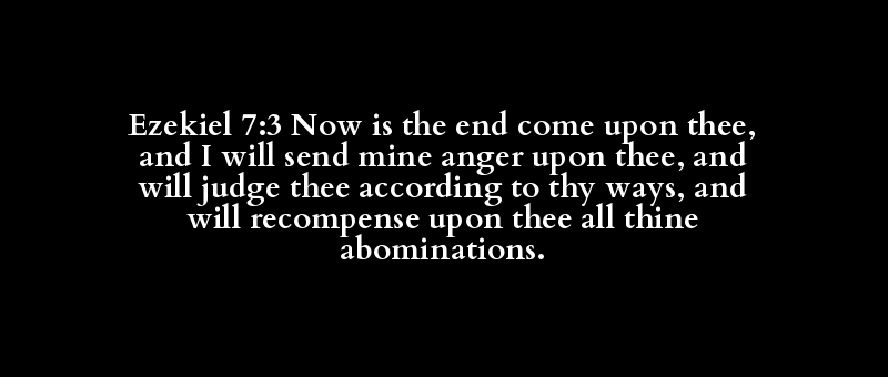 Ezekiel 7:3 Now is the end come upon thee, and I will send mine anger upon thee, and will judge thee according to thy ways, and will recompense upon thee all thine abominations.