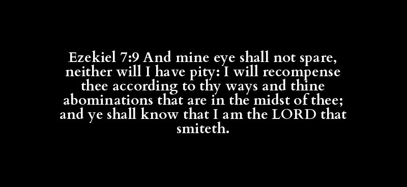Ezekiel 7:9 And mine eye shall not spare, neither will I have pity: I will recompense thee according to thy ways and thine abominations that are in the midst of thee; and ye shall know that I am the LORD that smiteth.