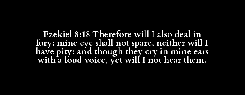 Ezekiel 8:18 Therefore will I also deal in fury: mine eye shall not spare, neither will I have pity: and though they cry in mine ears with a loud voice, yet will I not hear them.