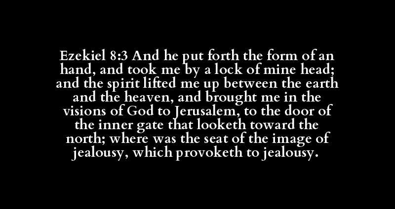 Ezekiel 8:3 And he put forth the form of an hand, and took me by a lock of mine head; and the spirit lifted me up between the earth and the heaven, and brought me in the visions of God to Jerusalem, to the door of the inner gate that looketh toward the north; where was the seat of the image of jealousy, which provoketh to jealousy.