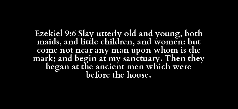 Ezekiel 9:6 Slay utterly old and young, both maids, and little children, and women: but come not near any man upon whom is the mark; and begin at my sanctuary. Then they began at the ancient men which were before the house.