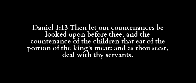 Daniel 1:13 Then let our countenances be looked upon before thee, and the countenance of the children that eat of the portion of the king's meat: and as thou seest, deal with thy servants.