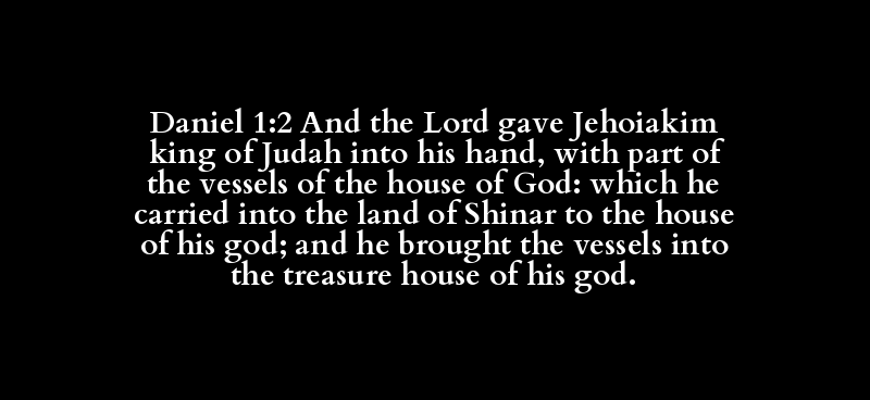 Daniel 1:2 And the Lord gave Jehoiakim king of Judah into his hand, with part of the vessels of the house of God: which he carried into the land of Shinar to the house of his god; and he brought the vessels into the treasure house of his god.