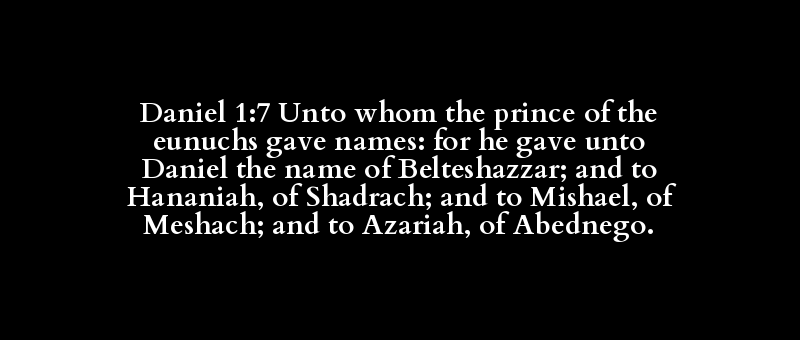 Daniel 1:7 Unto whom the prince of the eunuchs gave names: for he gave unto Daniel the name of Belteshazzar; and to Hananiah, of Shadrach; and to Mishael, of Meshach; and to Azariah, of Abednego.