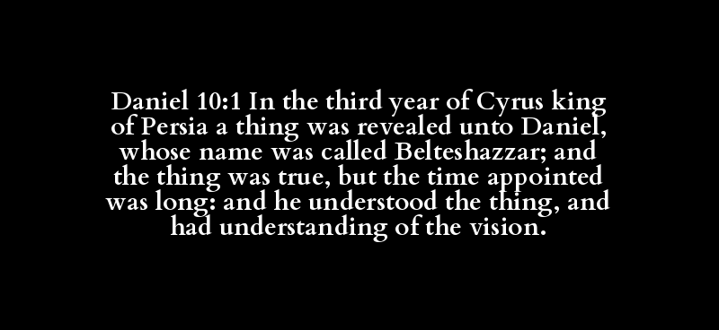 Daniel 10:1 In the third year of Cyrus king of Persia a thing was revealed unto Daniel, whose name was called Belteshazzar; and the thing was true, but the time appointed was long: and he understood the thing, and had understanding of the vision.