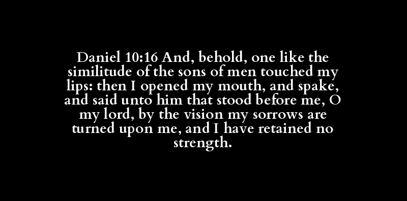 Daniel 10:16 And, behold, one like the similitude of the sons of men touched my lips: then I opened my mouth, and spake, and said unto him that stood before me, O my lord, by the vision my sorrows are turned upon me, and I have retained no strength.