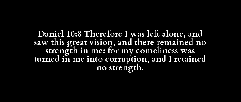Daniel 10:8 Therefore I was left alone, and saw this great vision, and there remained no strength in me: for my comeliness was turned in me into corruption, and I retained no strength.