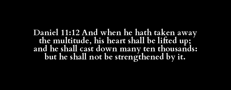 Daniel 11:12 And when he hath taken away the multitude, his heart shall be lifted up; and he shall cast down many ten thousands: but he shall not be strengthened by it.
