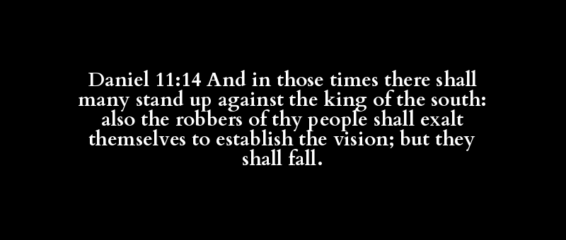 Daniel 11:14 And in those times there shall many stand up against the king of the south: also the robbers of thy people shall exalt themselves to establish the vision; but they shall fall.