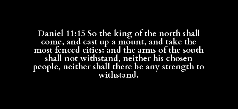 Daniel 11:15 So the king of the north shall come, and cast up a mount, and take the most fenced cities: and the arms of the south shall not withstand, neither his chosen people, neither shall there be any strength to withstand.
