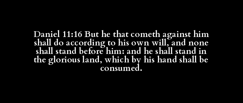 Daniel 11:16 But he that cometh against him shall do according to his own will, and none shall stand before him: and he shall stand in the glorious land, which by his hand shall be consumed.